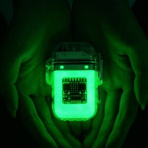 futuristic electronic lighter with a transparent, colorful casing. It features a visible circuit board, a metallic top,